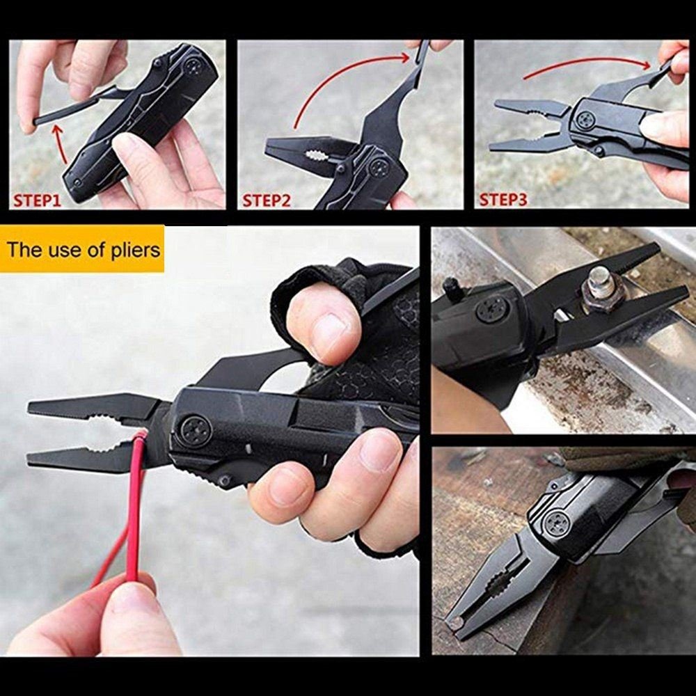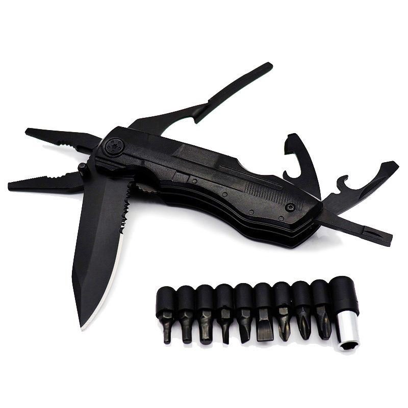 Other built-in tools are pliers, wire cutters, bottle/can openers, and a screwdriver with 10 heads.