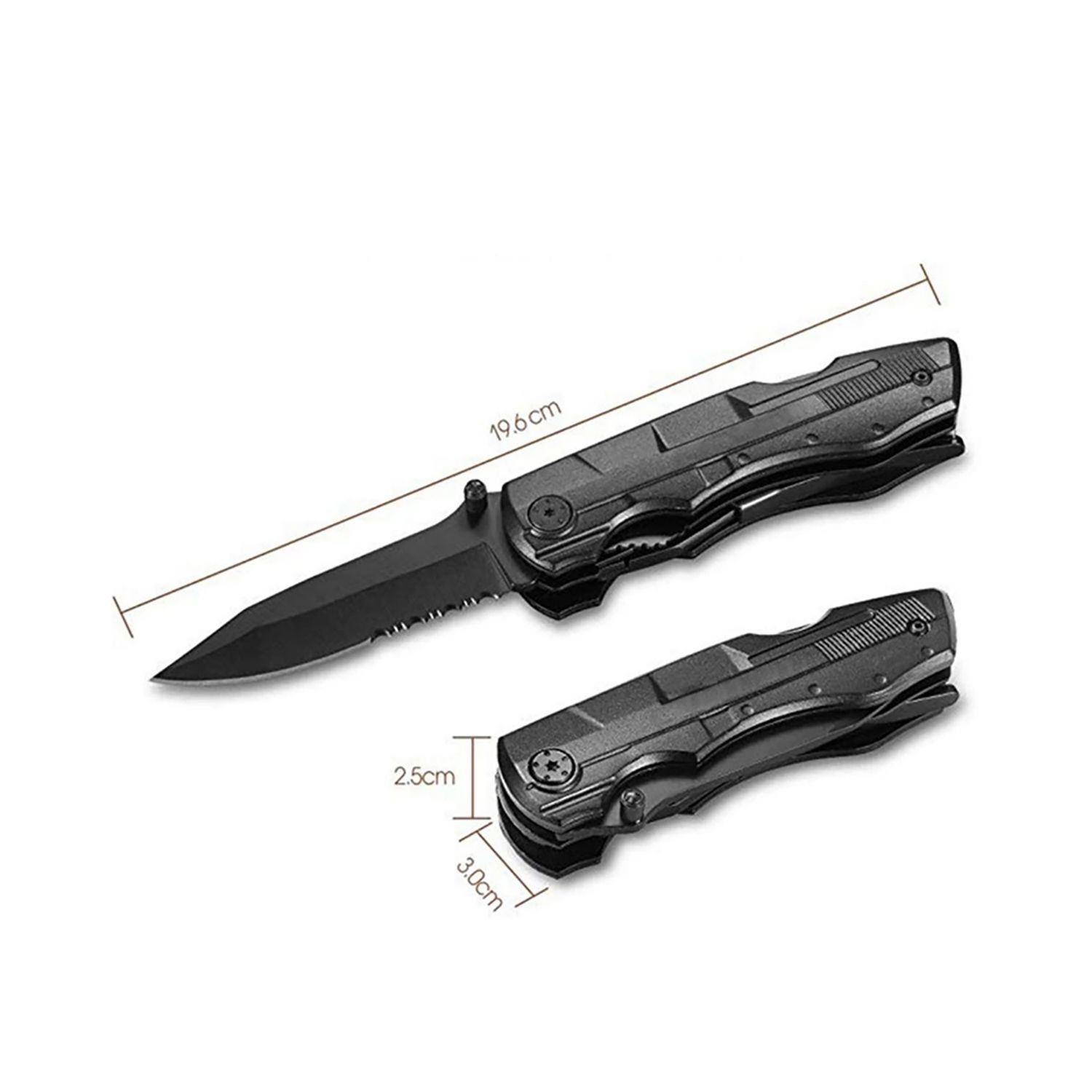 Well-built, the 7N1 Pocket Knife Tool features a full 3' knife with a half serrated, half smooth stainless-steel blade. The discretely integrated safeguard locking mechanism prevents the blade from accidentally closing on your fingers by requiring you to push inward on the gear-shaped safety release to fold it.